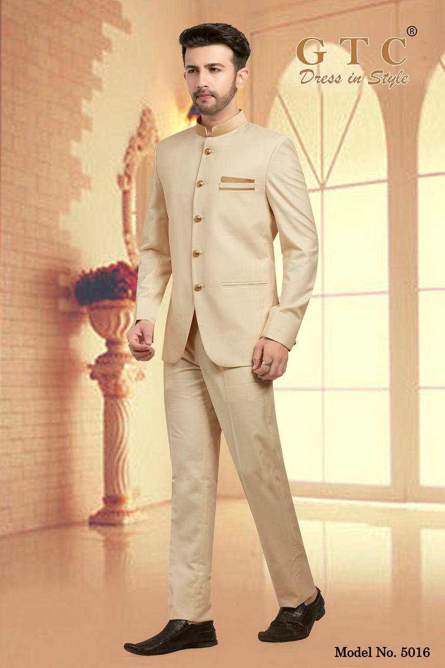 Exhibit charm & grace with this elegant GTC-Jodhpuri Suit designed on Imported Terry Rayon fabric enhanced with complementing highlights on collar, upper-pocket & handkerchief. Perfectly tailored for the discerning gentleman, it is paired with a light gold formal pant, making it ideal for any upscale occasion. At GTC Dress In Style, we believe in offering attire that embodies sophistication and modern elegance. Elevate your wardrobe with this distinctive ensemble that promises to leave a lasting impression. Discover unmatched quality and impeccable style today!
