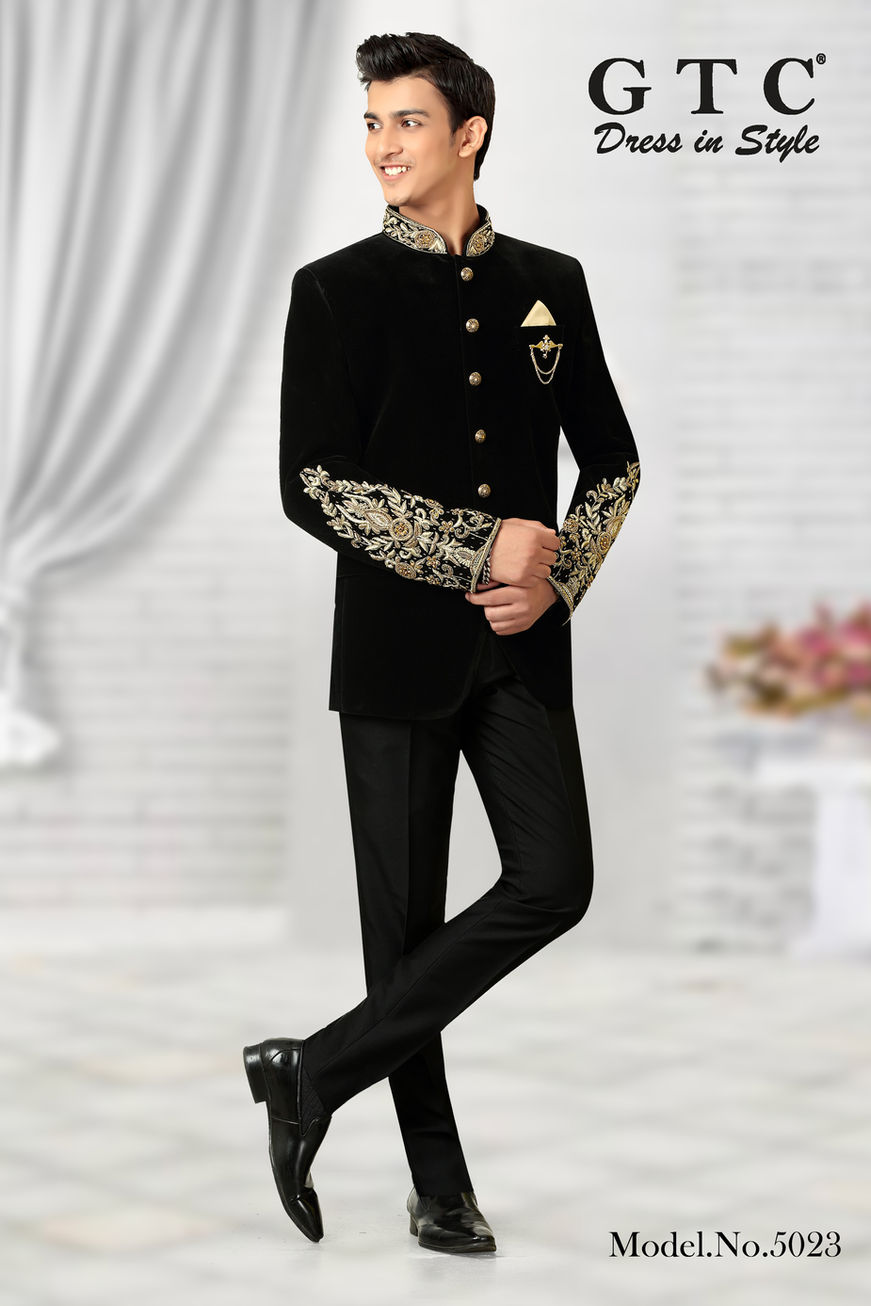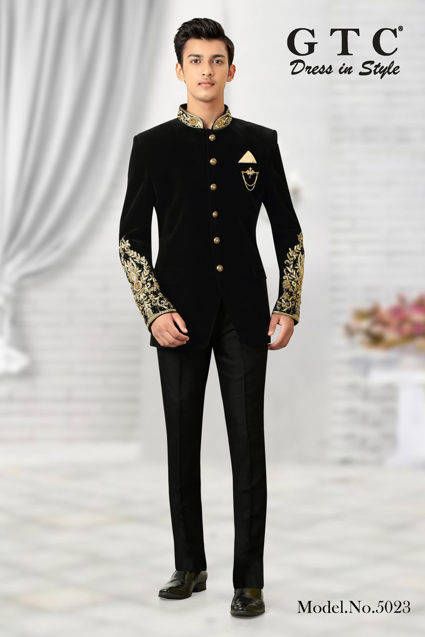 Feel royal with this GTC-Jodhpuri Suit on black velvet with gold hand-beaded work on the collar, front, sleeves, and back. Its straight symmetrical cut epitomizes sophistication and grace. Paired with black formal pants, it blends tradition and modernity. At GTC Dress In Style, we deliver timeless pieces of luxury and class. Elevate your wardrobe with this ensemble that reflects our dedication to quality and craftsmanship.