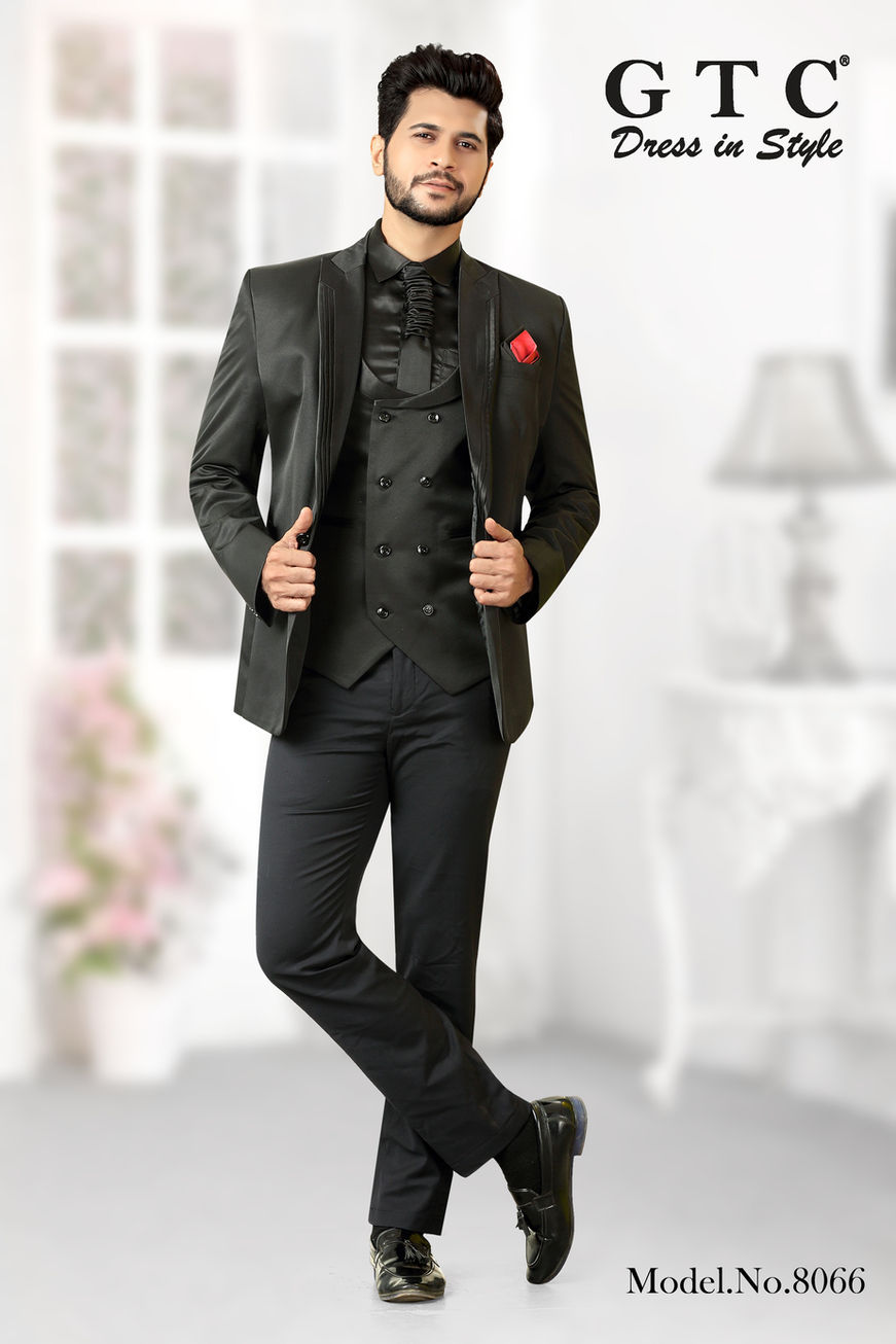 Experience an assemblage of royalty & splendor with our slick GTC-5-piece Designer Men Suit. Handcrafted on luxurious imported Terry Rayon fabric, this ensemble commands attention with its refined black-to-black color scheme. The stylish waistcoat and tie are perfected by a striking red pocket square that elevates your elegance. Paired seamlessly with black trousers, you'll feel distinguished and poised in any setting. Discover the true essence of sophisticated fashion at GTC Dress In Style.